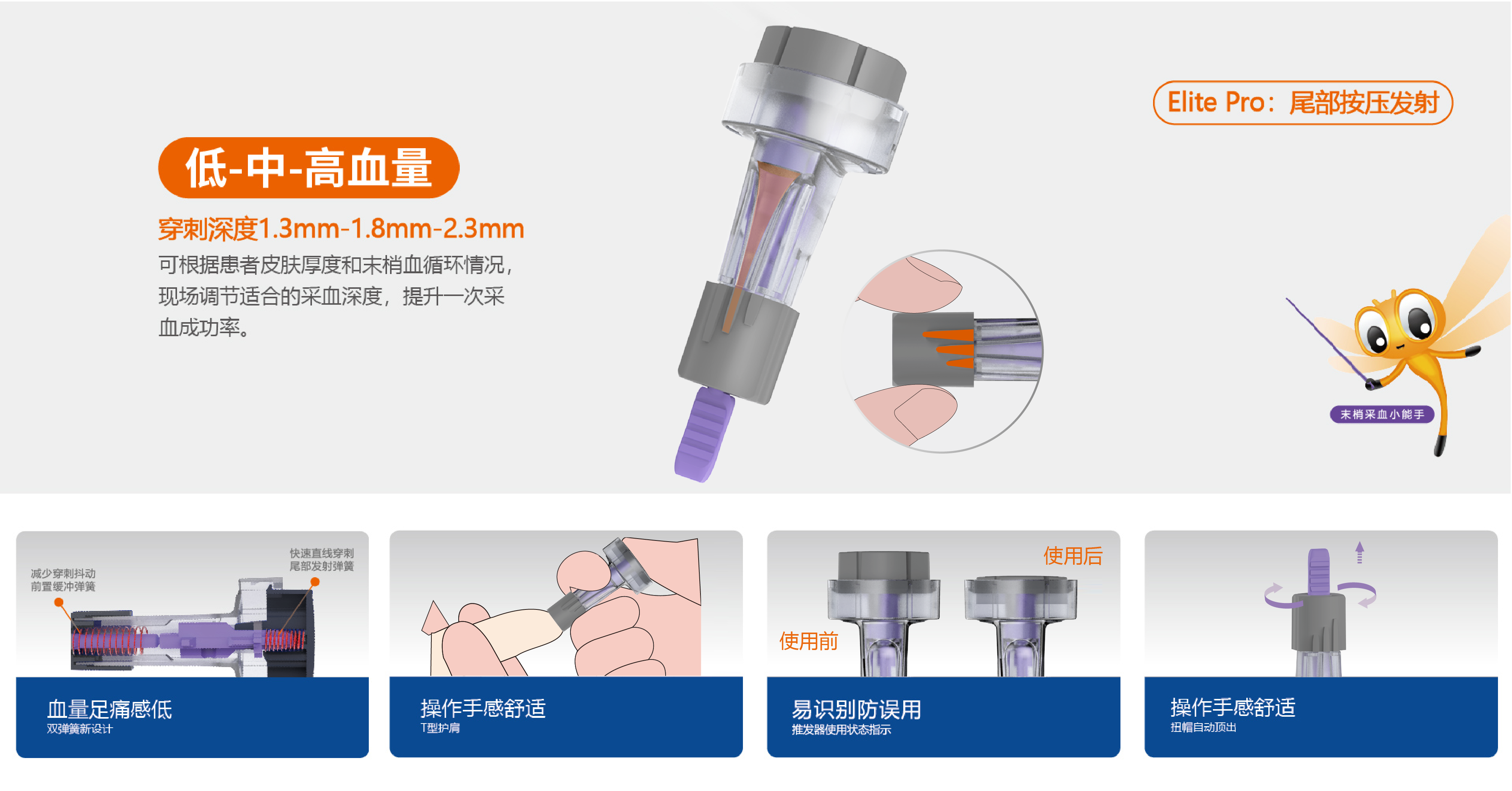 血器,穿刺深度可有多種選擇,應(yīng)根據(jù)檢測(cè)項(xiàng)目選擇合適的采血器。